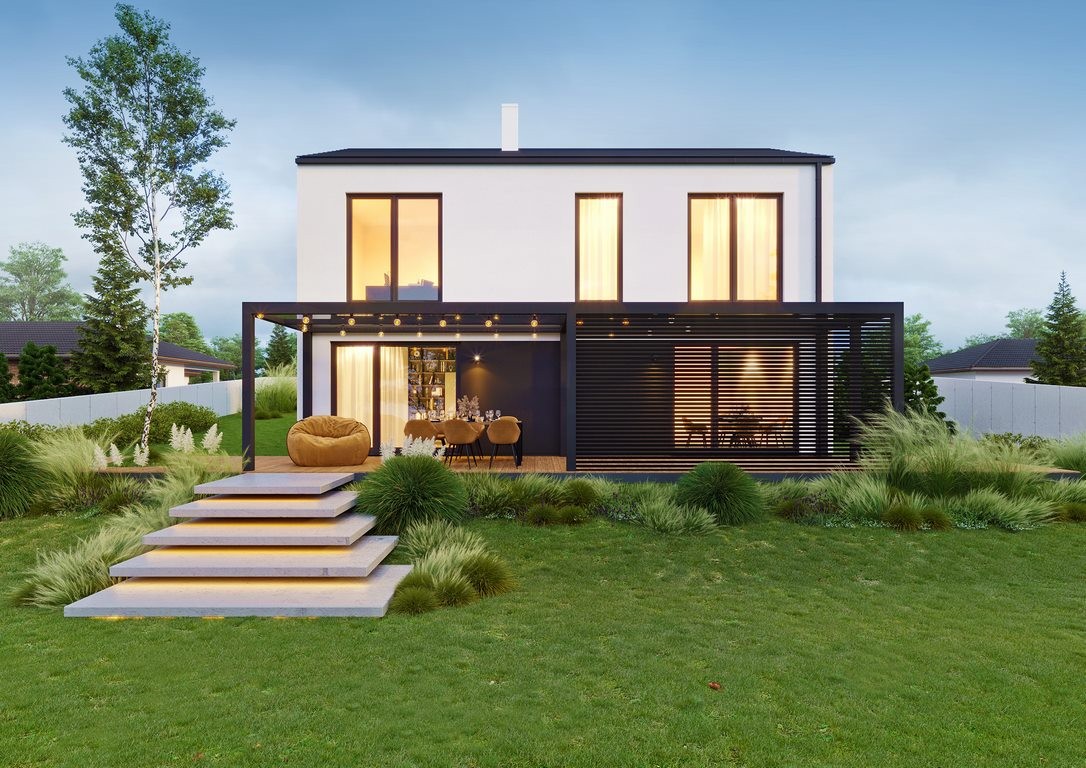 Moderní dvoupodlažní dům HP140 o celkové vnitřní užitné ploše 140,68m2 s dispozicí 5+kk je vhodný na pozemky široké od 15,5m.