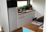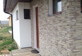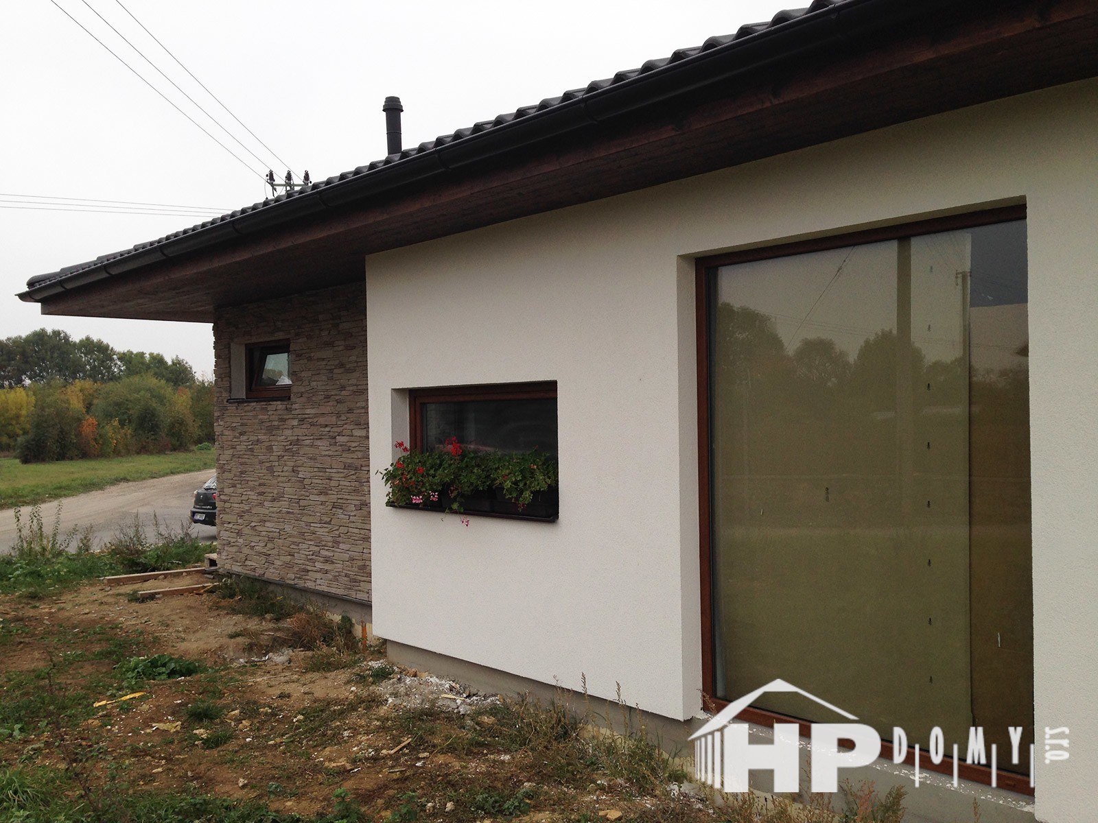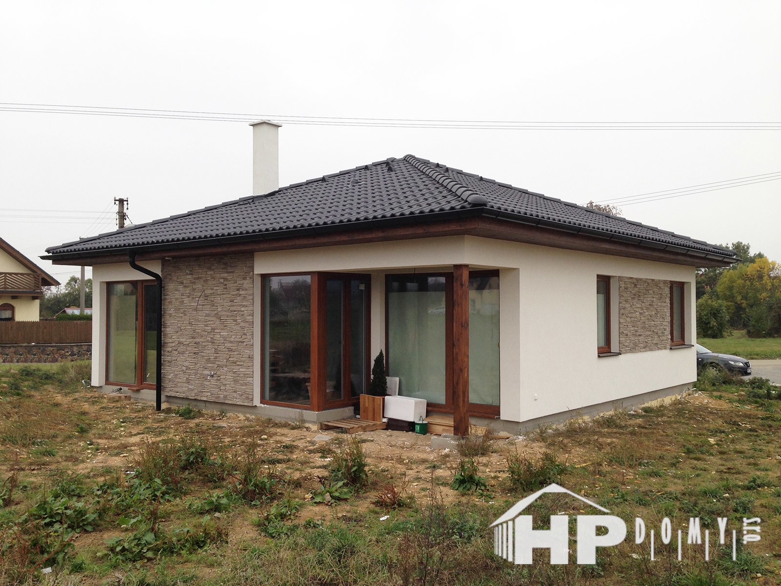 Individuální projekt difúzně otevřené dřevostavby 3+kk v obci Červený Újezd, Praha-západ. Celková užitná plocha domu činí 71 m2. Dům nabízí prosvětlený obývací pokoj s krbovými kamny, kuchyňským koutem se spíží a posuvnými francouzskými dveřmi na terasu. V koupelně je na přání klientky umístěna mimo sprchový kout také sauna. V celém domě je systém teplovodního podlahového vytápění napojený na plynový kotel, který se nachází v samostatné technické místnosti. Dřevěné podlahy na chodbě a v obytných místnostech příjemně dotváří komfort celého interiéru. Fasáda domu v bílé barvě je doplněna obkladem z umělého kamene Magicrete v dekoru Toronto.