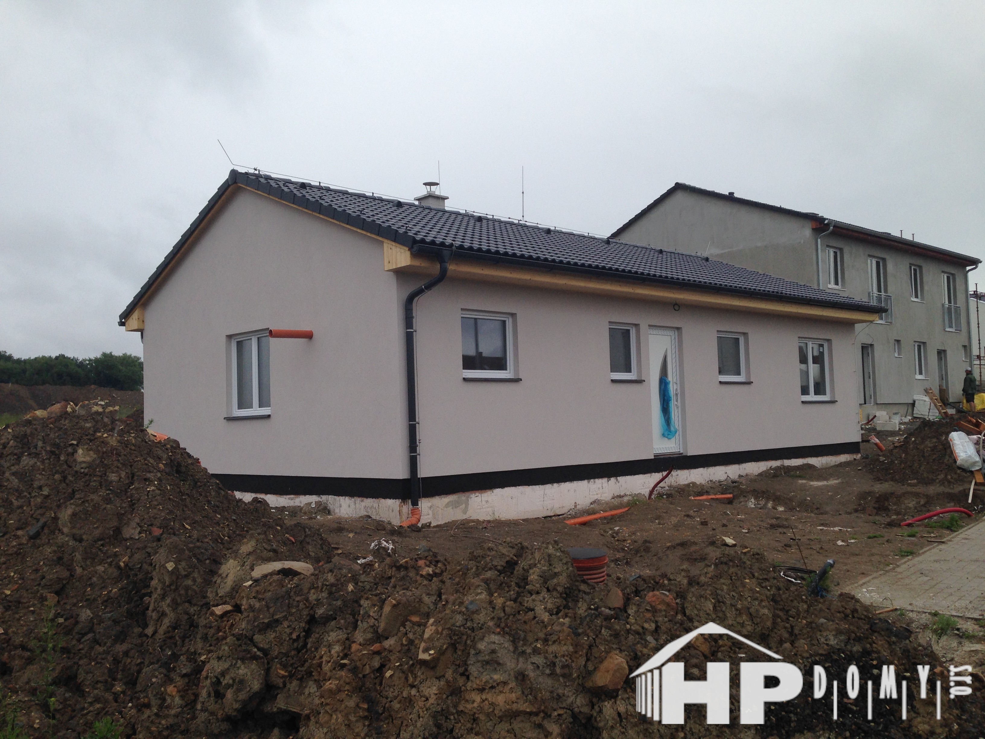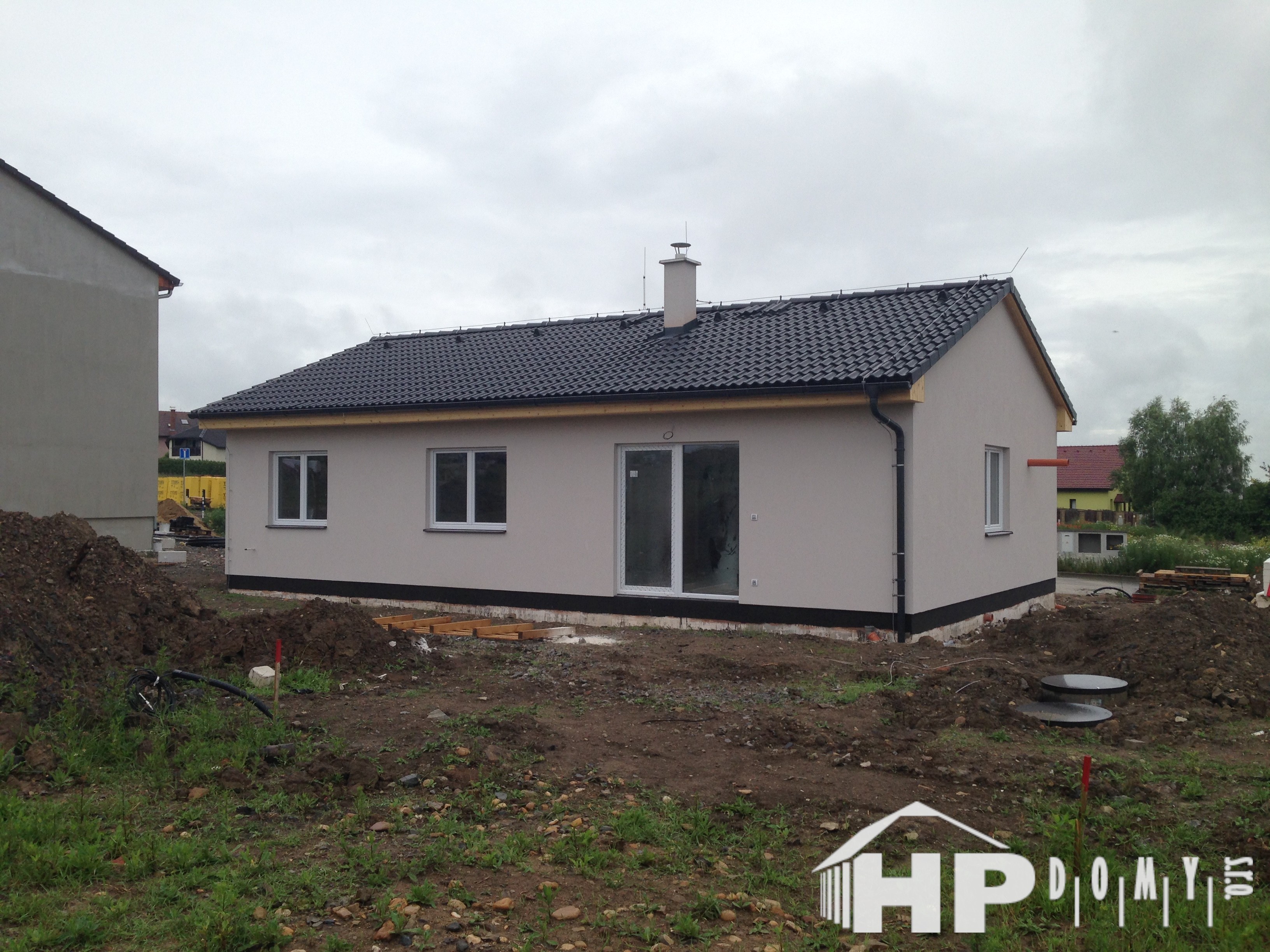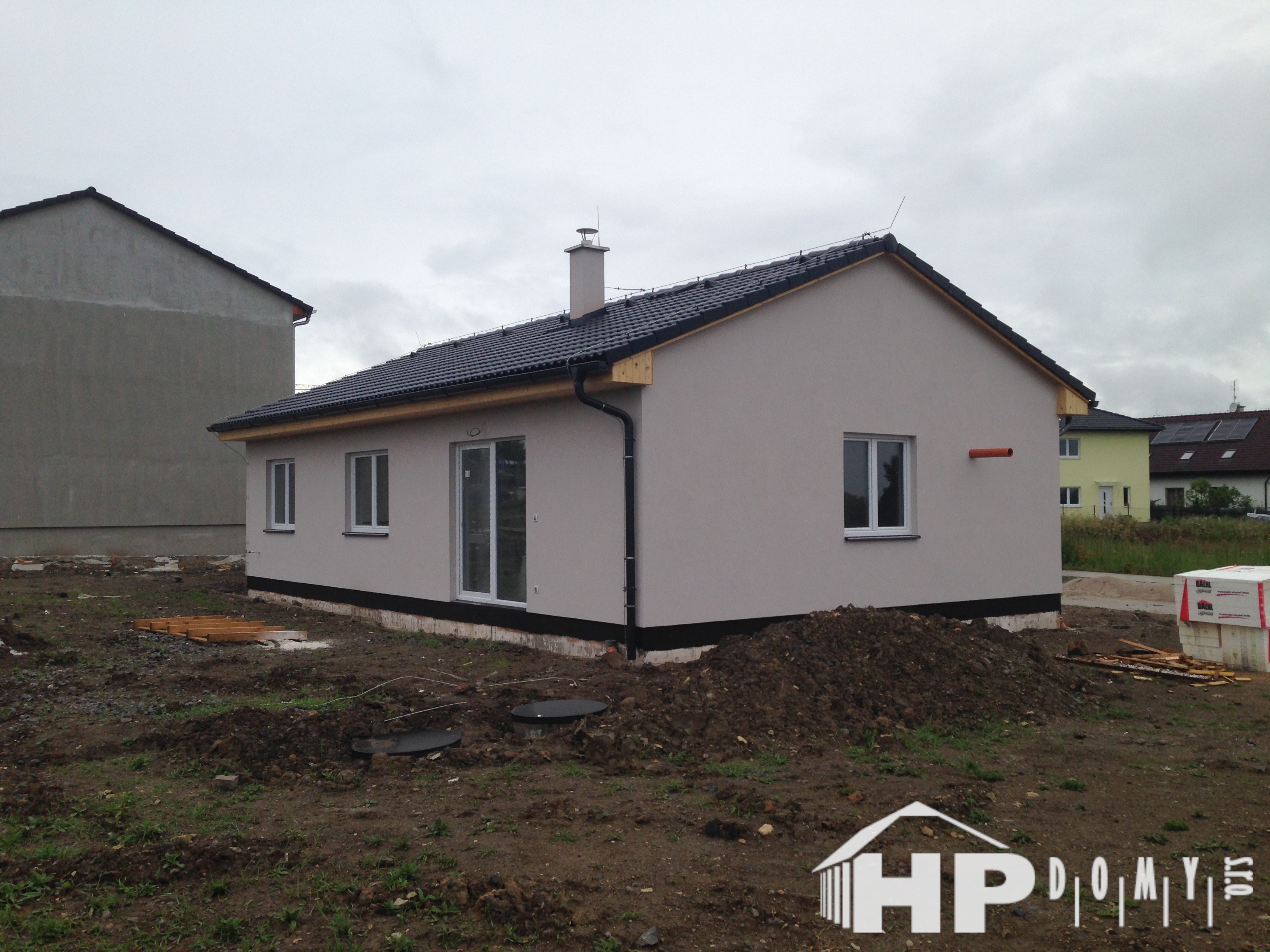 Dokončená realizace našeho oblíbeného typového bungalovu HP90 v Chýni u Prahy. Difuzně uzavřená dřevostavba s dispozicí 4+kk a užitnou plochou 90 m2 je ideální pro 4člennou rodinu. Propracovaná studie rodinného domu HP90 zaručuje vysokou kvalitu provedení spolu s ekonomicky přijatelným řešením – díky tomu je dům cenově dostupný opravdu pro každého. Dům nabízí prostorný obývací pokoj s kuchyňským koutem a spíží, kde je použito podlahové vytápění; ložnici, 2 dětské pokoje, prostornou koupelnu s vanou a sprchovým koutem, komfortní zádveří a technickou místnost se samostatným WC. Velké francouzské okno v obývacím pokoji zajistí dostatečné množství světla a pohodlný vstup na zahradu.