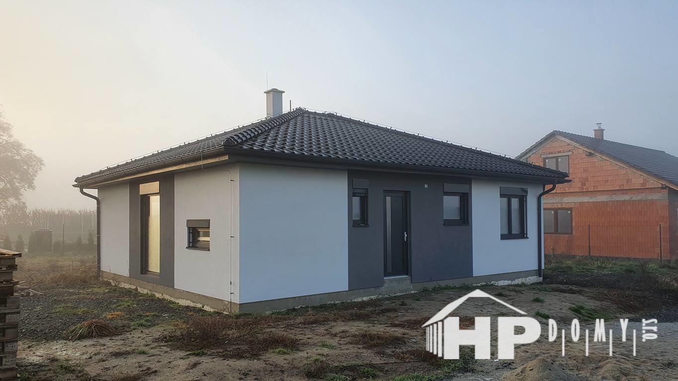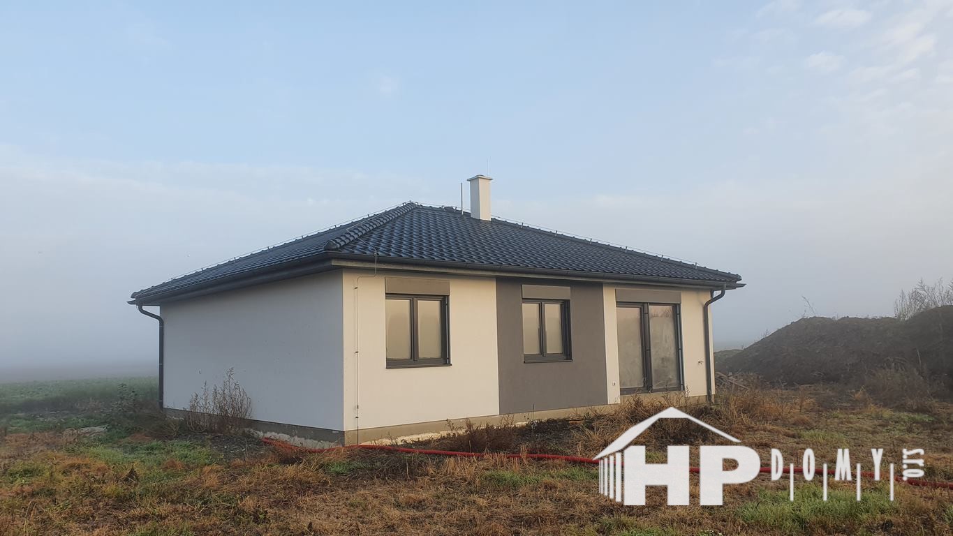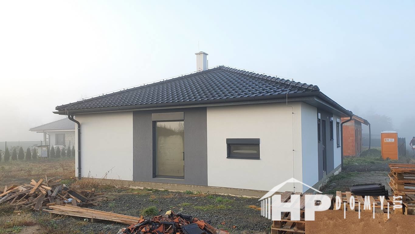 Dokončená stavba bungalovu o rozloze 99 metrů čtverečních a dispozici 4+kk v Dluhonicích.