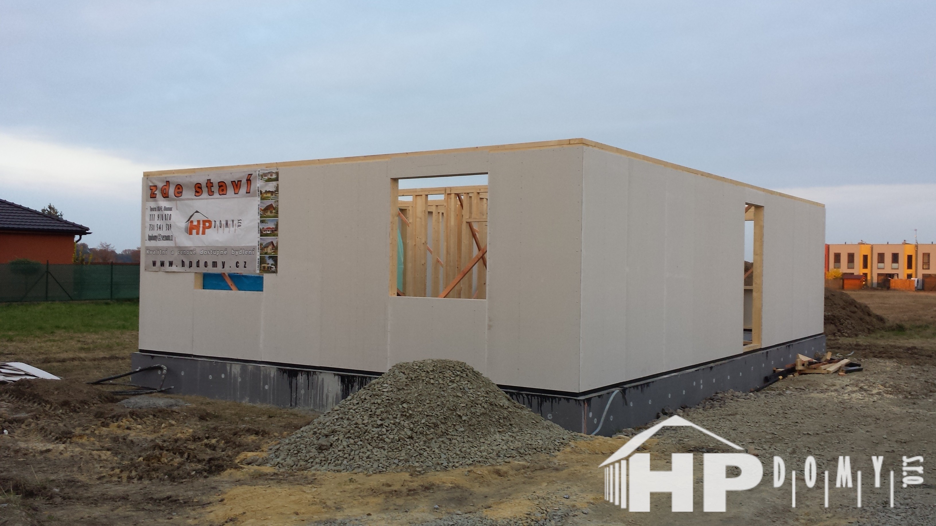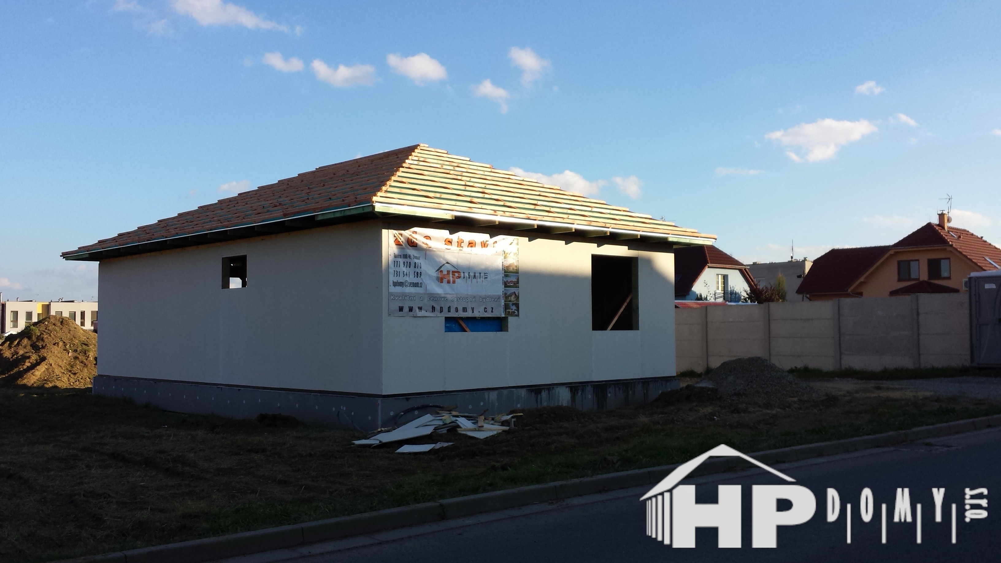 Stavba rodinného domu v Domamyslicích u Prostějova. Investor objednal POUZE realizaci základové desky s prostupy a hydroizolací, opláštěnou konstrukci a konstrukci vazníkového krovu. Zbylé práce realizuje svépomocí či dílčími subdodavateli.