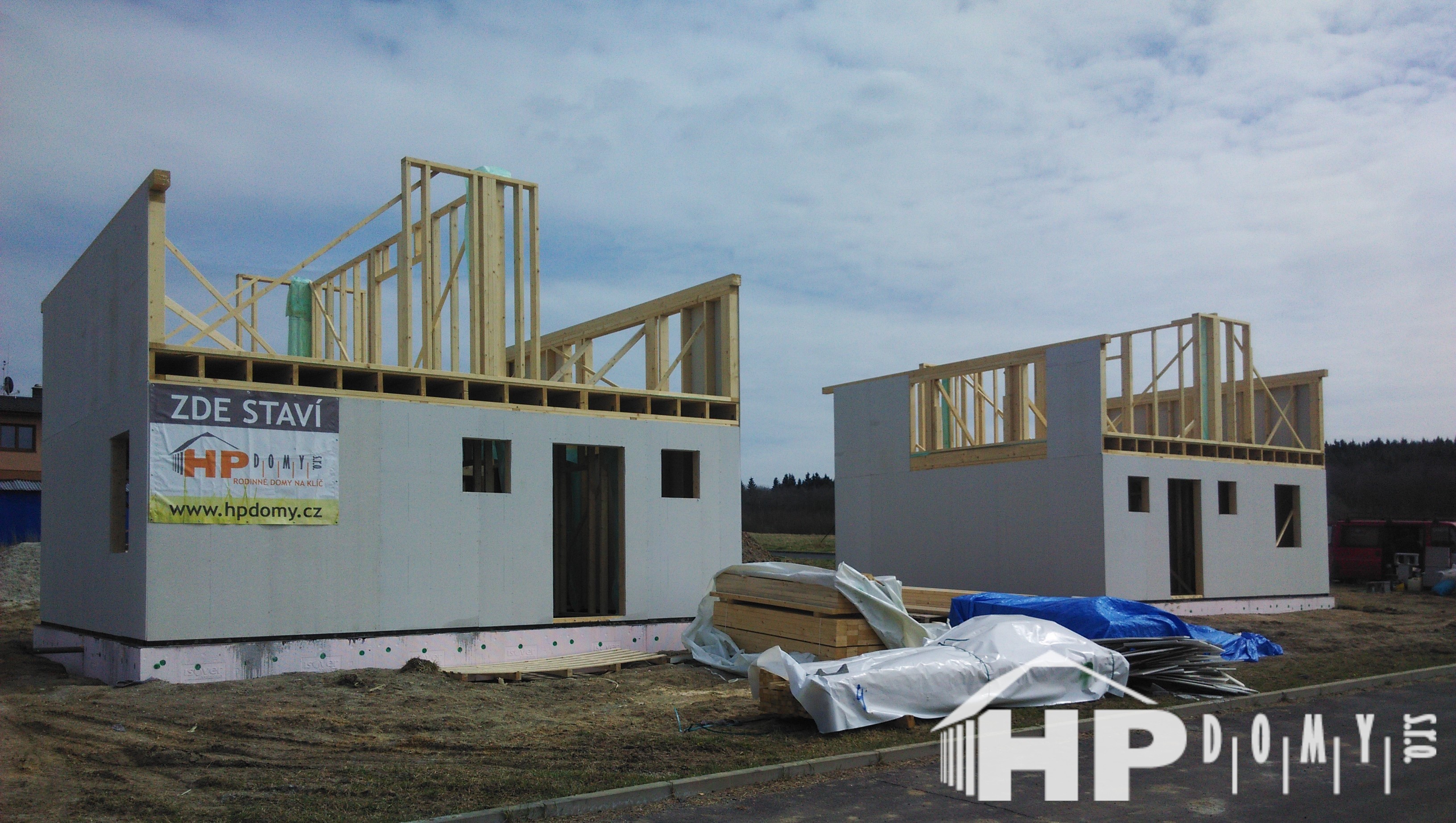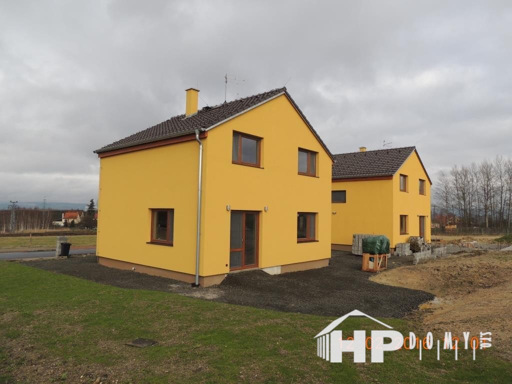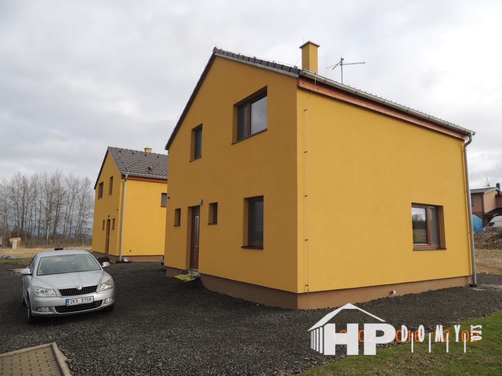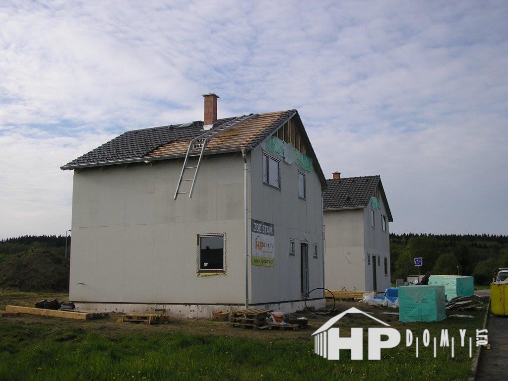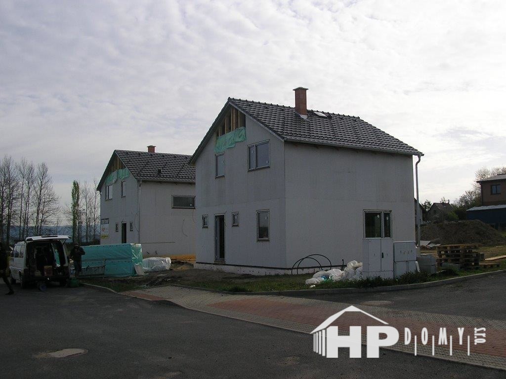 Dvě stejné dřevostavby patrových rodinných domů realizované v obci Hory na Karlovarsku.