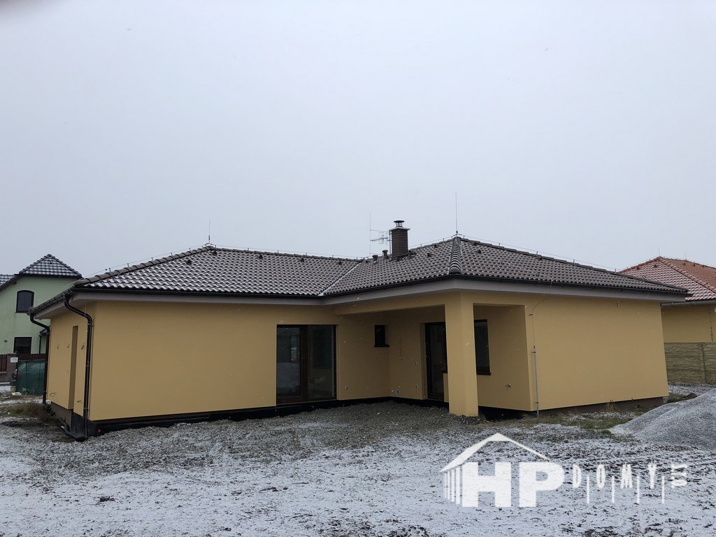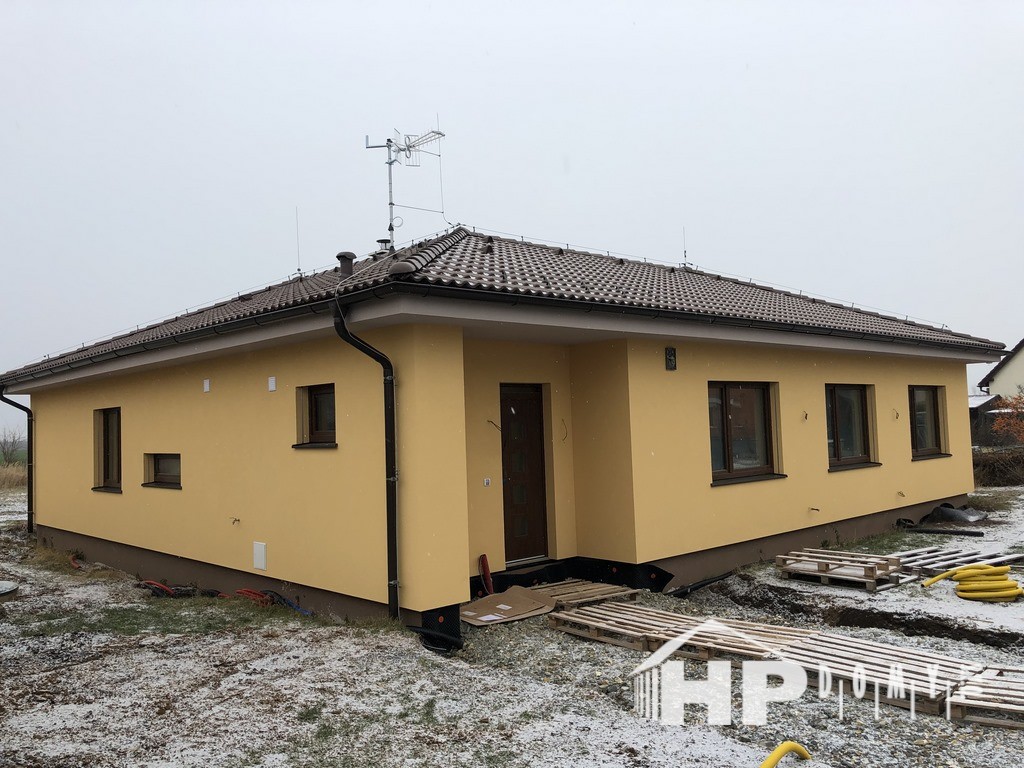 Zděný dům typu bungalov s teplovodním podlahovým topením, 3 ložnicemi, šatnou, zahradním skladem, technickou místností, koupelnou, samostatným WC, obývacím pokojem s kuchyní a spíží.