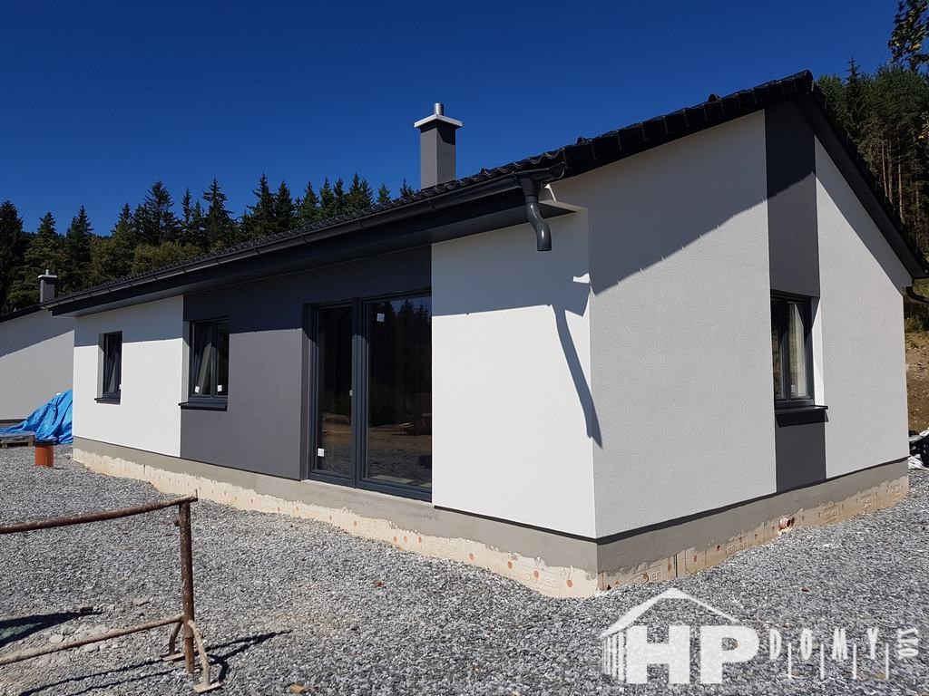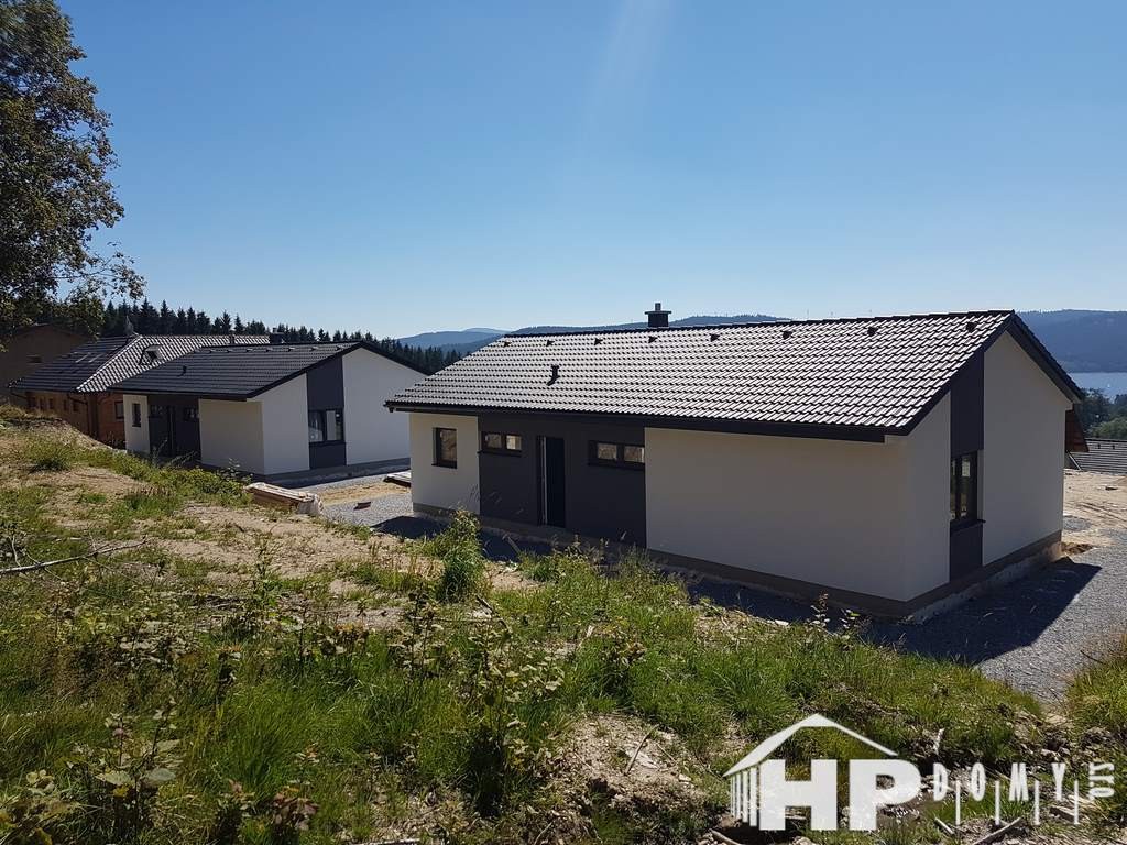 Dvojice bungalovů HP90 v krásné lokalitě Lipna nad Vltavou. Difuzně uzavřená dřevostavba s dispozicí 4+kk a užitnou plochou 90 m2 je ideální pro 4člennou rodinu. Propracovaná studie rodinného domu HP90 zaručuje vysokou kvalitu provedení spolu s ekonomicky přijatelným řešením – díky tomu je dům cenově dostupný opravdu pro každého. Dům nabízí prostorný obývací pokoj s kuchyňským koutem a spíží, kde je použito podlahové vytápění; ložnici, 2 dětské pokoje, prostornou koupelnu s vanou a sprchovým koutem, komfortní zádveří a technickou místnost se samostatným WC. Velké francouzské okno v obývacím pokoji zajistí dostatečné množství světla a pohodlný vstup na zahradu.