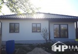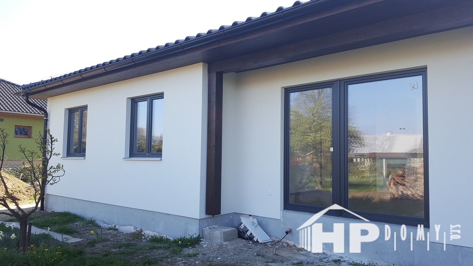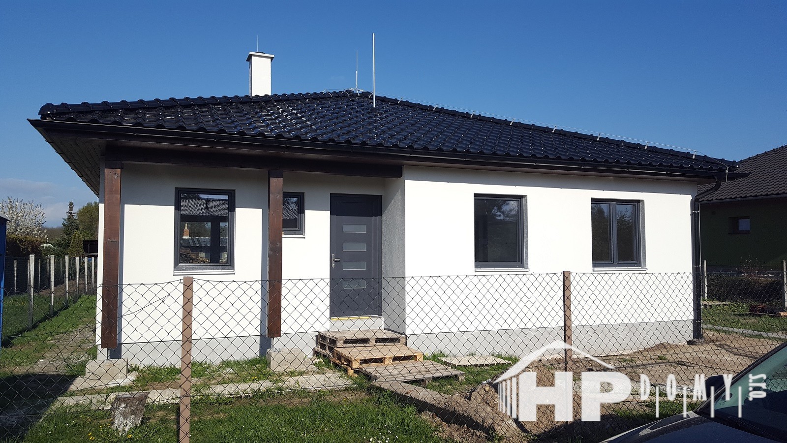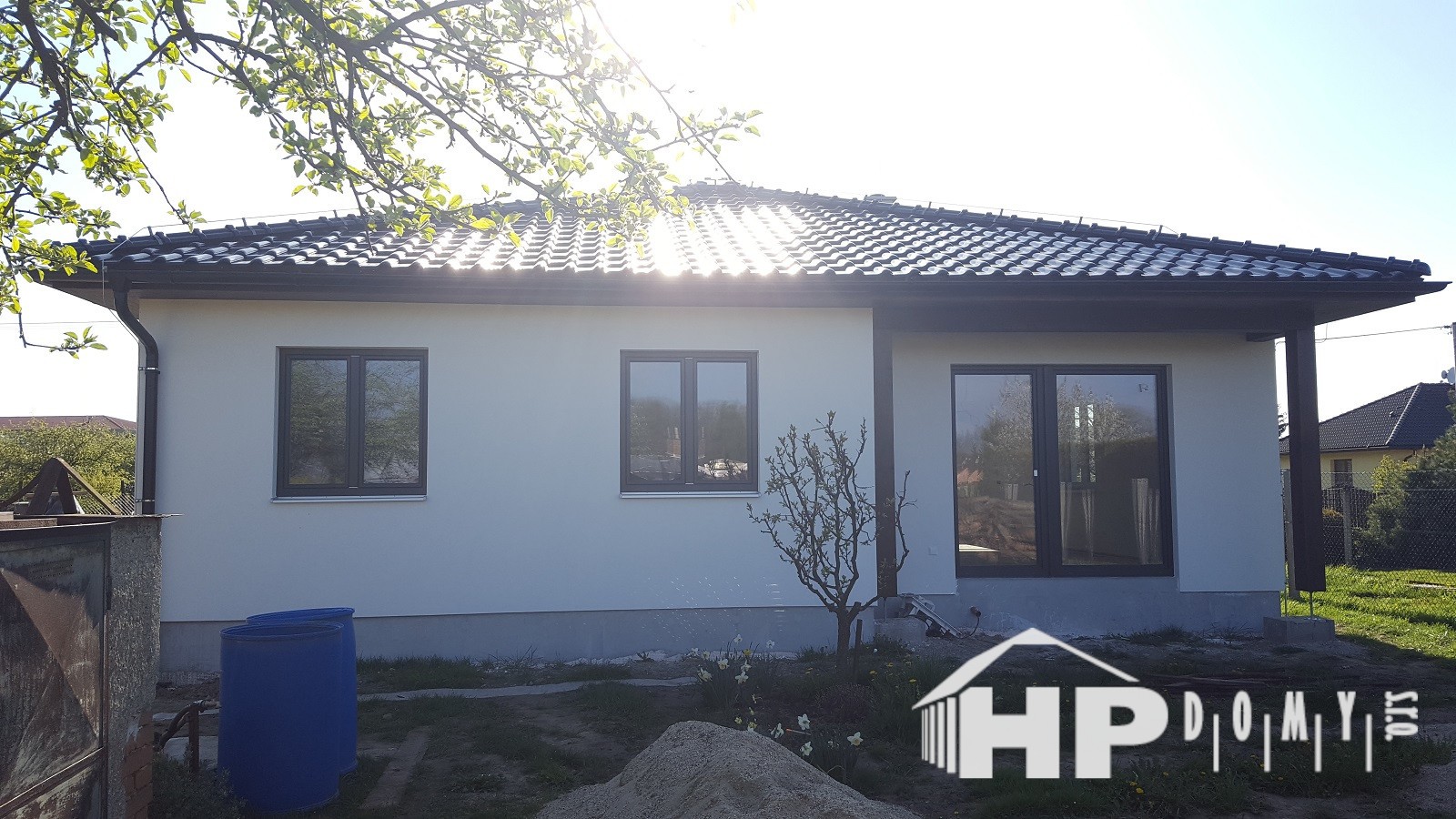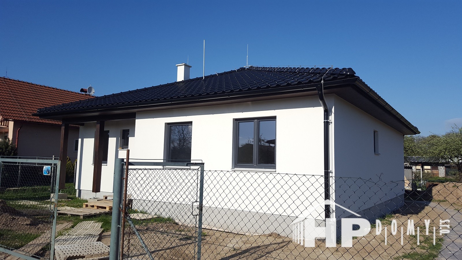 Stále oblíbenější bungalov s individuálními úpravami klienta, o celkové užitné ploše 94m2 a přesahem střechy v uličním i dvorním traktu. Dům byl vzhledem k lokalitě zvednut proti případným záplavám. Obsahuje komín s nadstandardní tepelně-akumulační krbovou obestavbou, podlahovým vytápěním v obývacím pokoji, kuchyni, koupelně a zádveří, posuvné dveře do pouzdra, designové prosklené interiérové dveře, vinylové podlahy, vyspádovanou dlažbu v technické místnosti a staticky upravenou terasu s nadstandardním prosklením do zahrady.