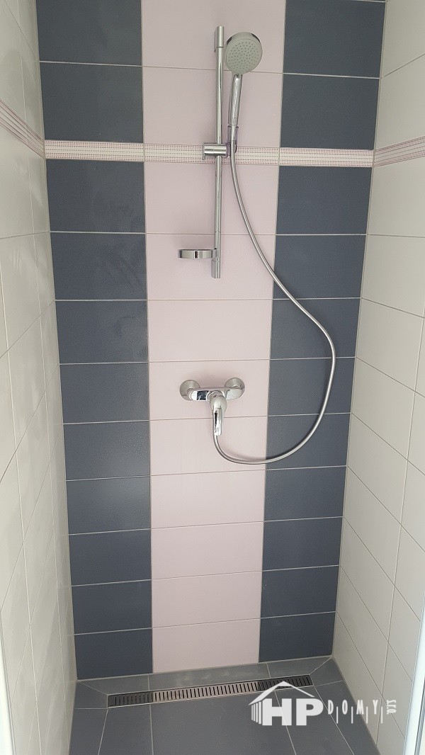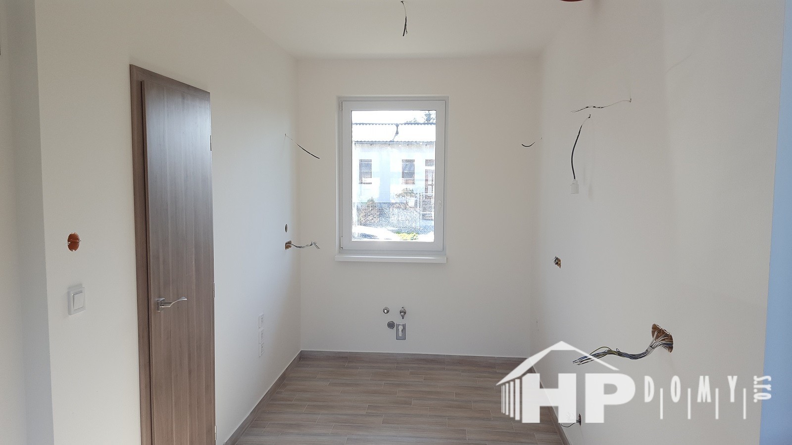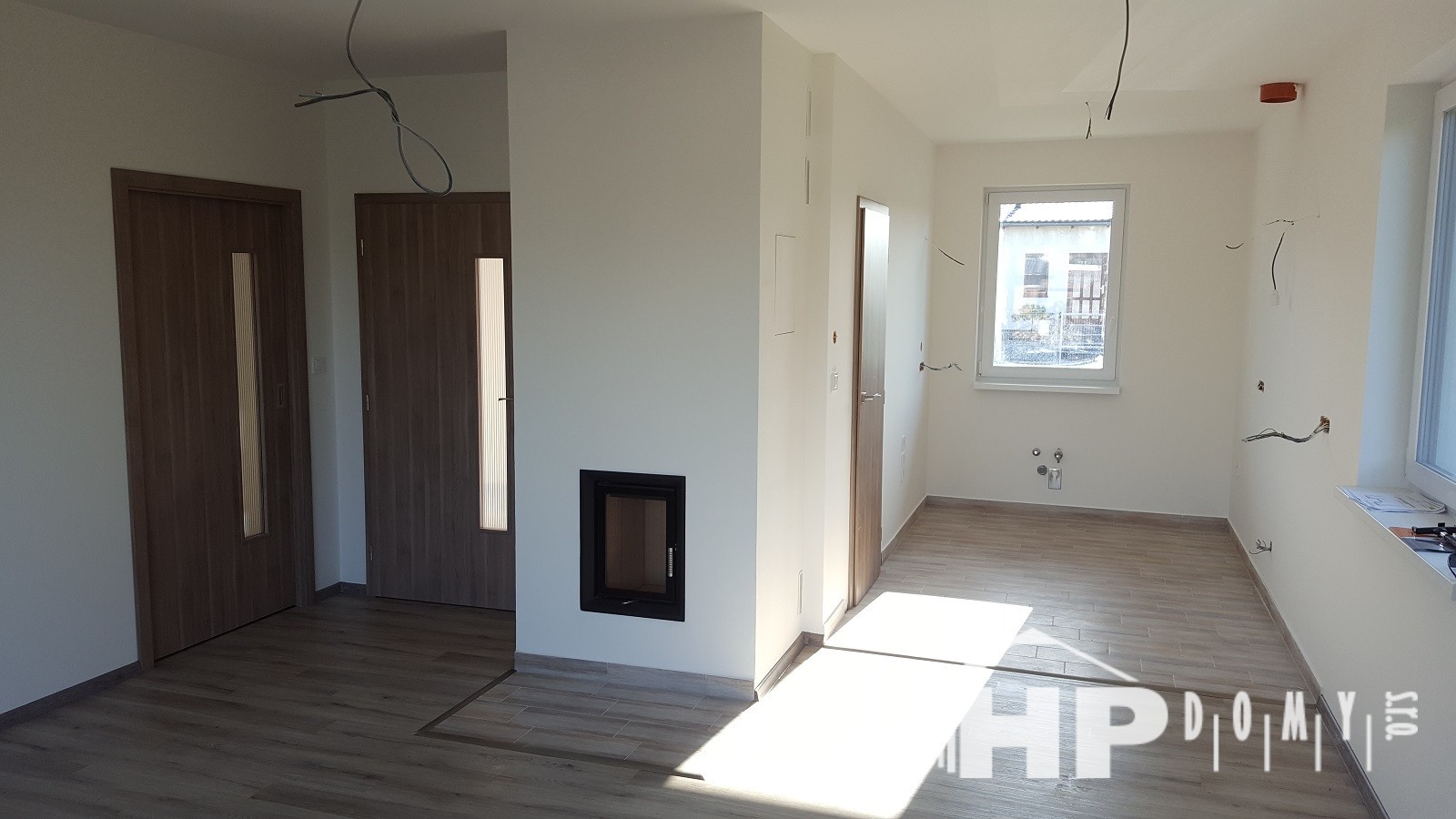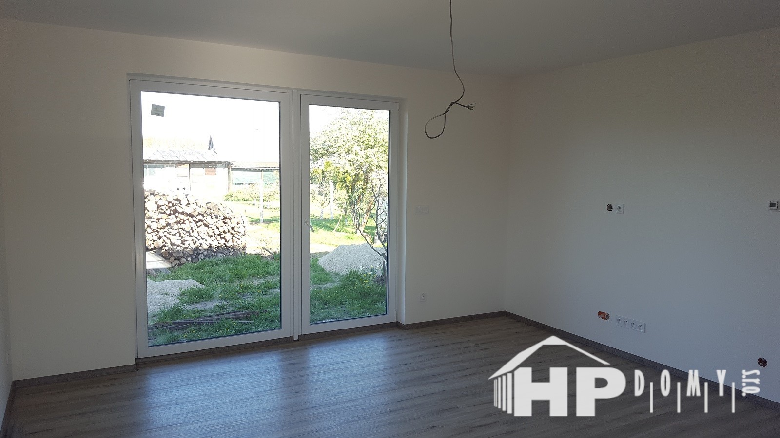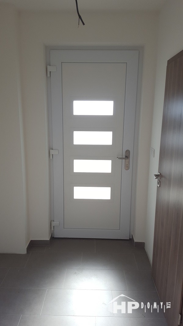 Stále oblíbenější bungalov s individuálními úpravami klienta, o celkové užitné ploše 94m2 a přesahem střechy v uličním i dvorním traktu. Dům byl vzhledem k lokalitě zvednut proti případným záplavám. Obsahuje komín s nadstandardní tepelně-akumulační krbovou obestavbou, podlahovým vytápěním v obývacím pokoji, kuchyni, koupelně a zádveří, posuvné dveře do pouzdra, designové prosklené interiérové dveře, vinylové podlahy, vyspádovanou dlažbu v technické místnosti a staticky upravenou terasu s nadstandardním prosklením do zahrady.