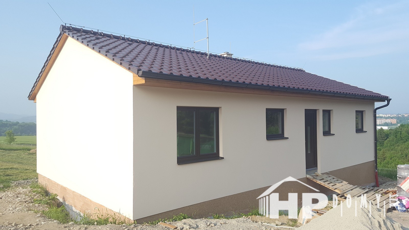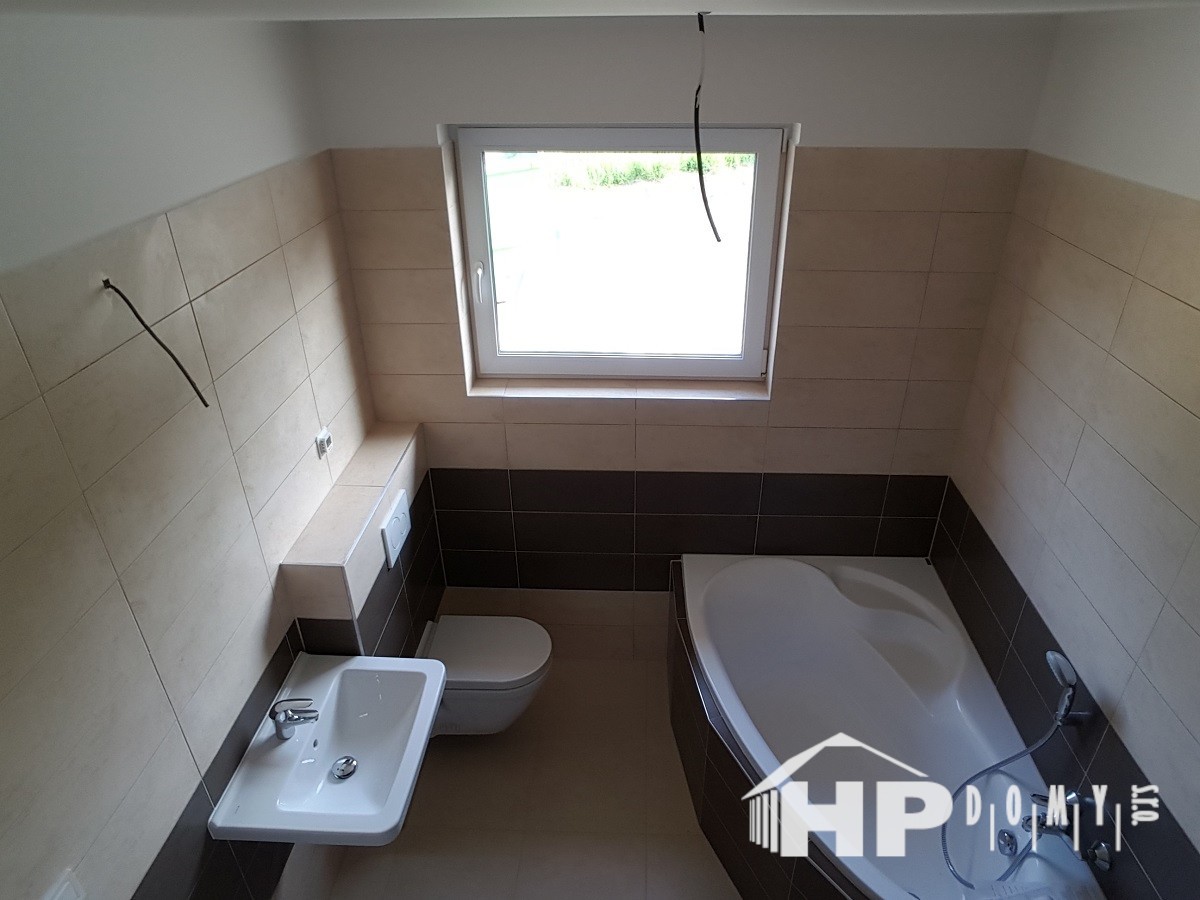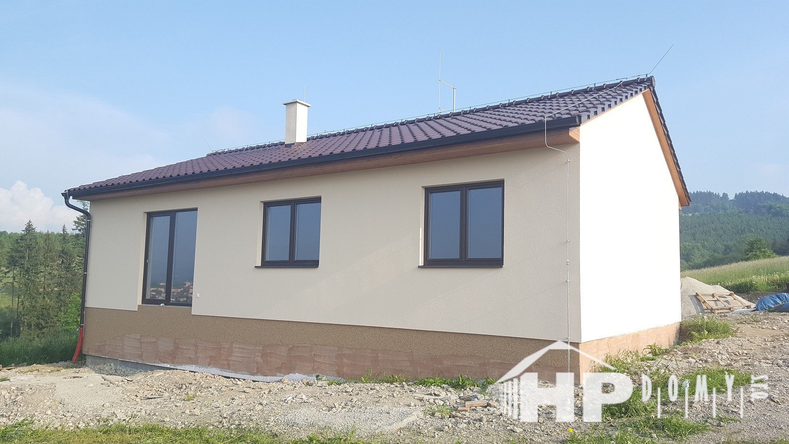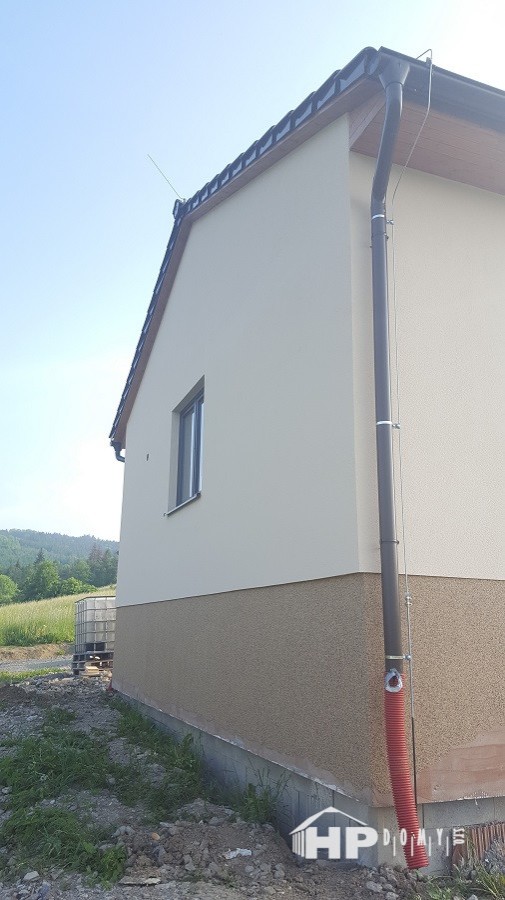 Další z realizací difúzně uzavřené dřevostavby našeho úspěšného projektu HP90. Tentokrát jsme se potýkali se svažitým terénem v obci Poličná u Valašského Meziříčí. Jako nadstandard zvolili klienti exteriérový dekor oken, stožár na anténu / satelit s hromosvodem – to vše s příplatkovou střešní taškou s glazurou a marmolit kopírující budoucí výšku terénu. V interiéru pak najdete nadstandardní podlahové topení v dětských pokojích, koupelně a zádveří, komín s přípravou na kamna, posuvné francouzské okno a toaletu navíc.