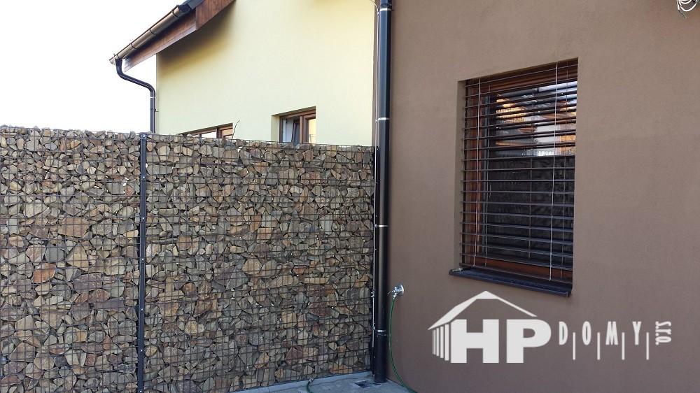 V přední části a mezi domy byly vystavěny gabionové kamenné ploty.