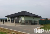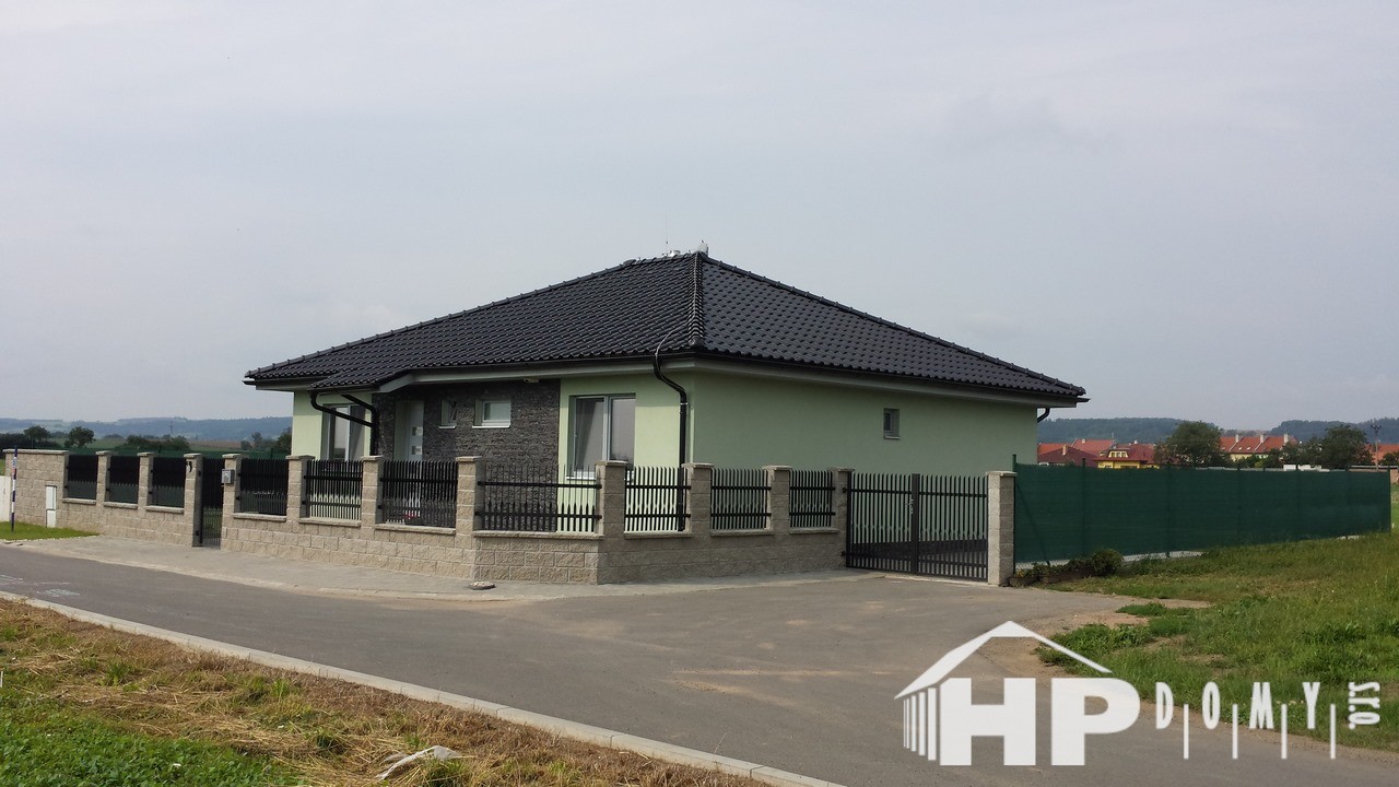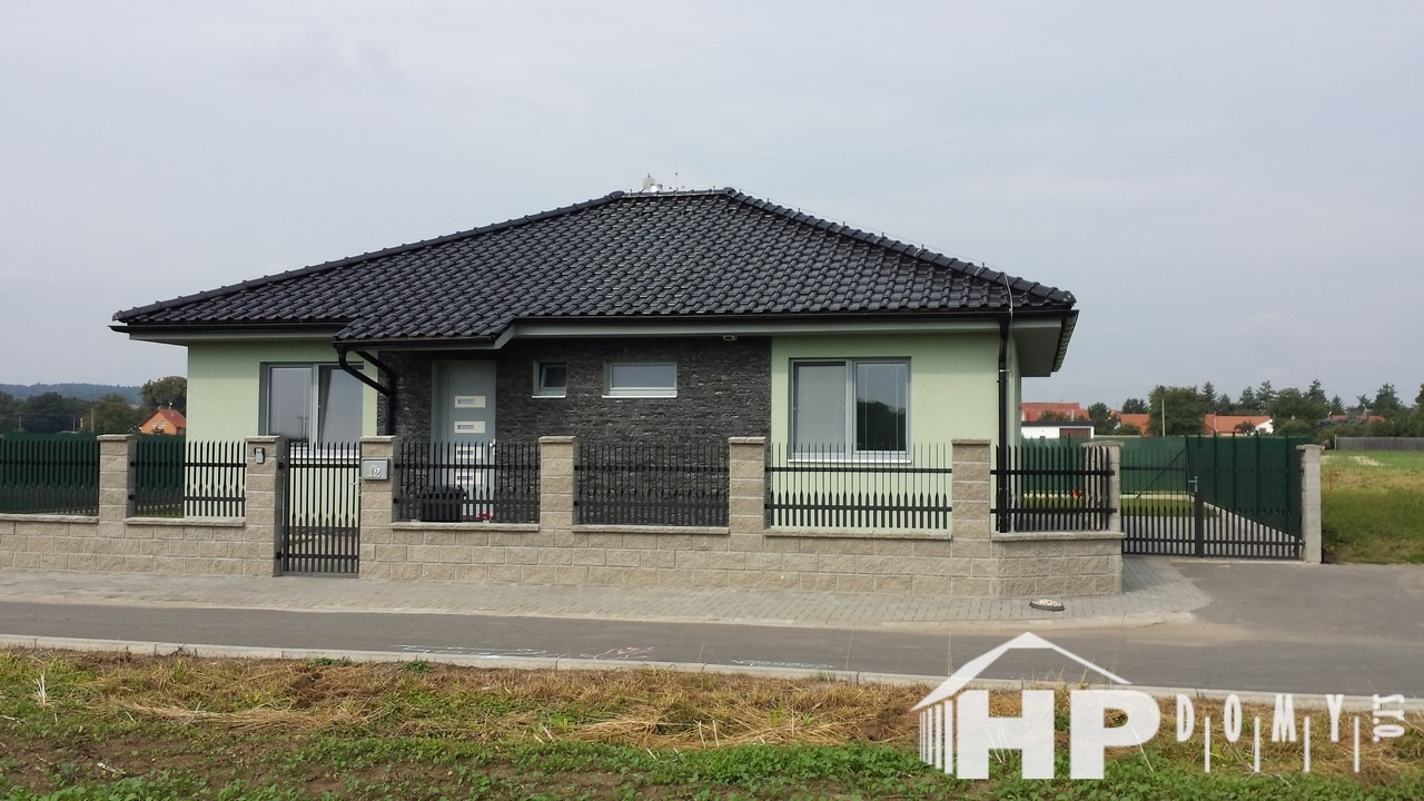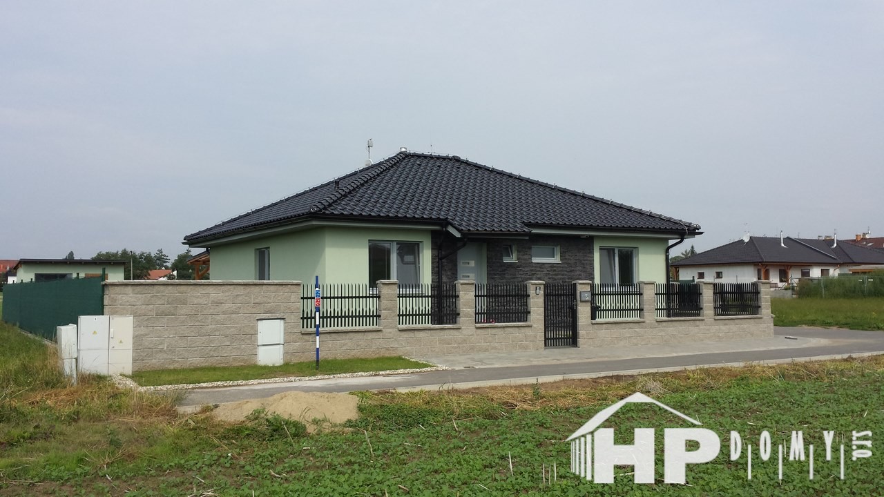 Stavba bungalovu o dispozici 5+kk s vnitřní užitnou plochou 109m2 a možností 2 koupelen. Tento typ jsme realizovali ve více variantách. Nabízí za příznivou cenu dispozici 5+kk. V tomto případě moderně sladěn s použitím elektrického podlahového vytápění v celém domě se samostatnými digitálními termostaty. Dále jako další zdroj vytápění instalována krbová vložka s obestavbou v obývacím pokoji. Středovou chodbu osvětluje mimo jiné nepřímé LED osvětlení. Koupelna vč. sprchového koutu, vany, závěsného WC a bidetu.