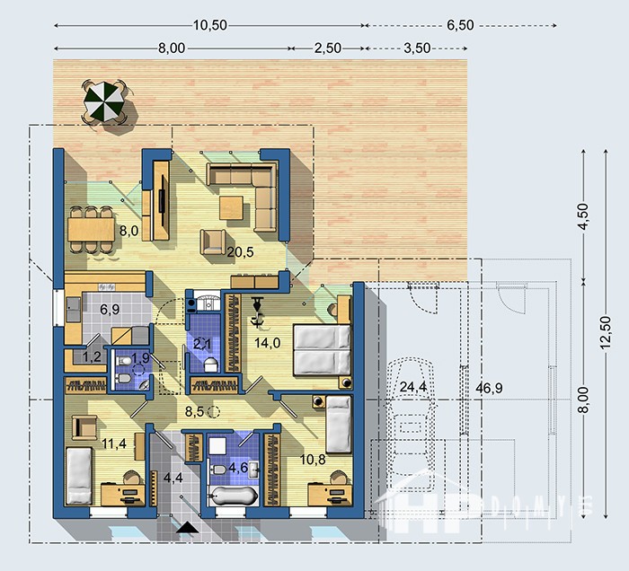 Dům s promyšleným dispozičním řešení 4+kk o užitné ploše 96 m2 je vytápěn teplovodním podlahovým vytápěním Giacomini napojeným na elektrokotel s doplňkovým zdrojem tepla ve formě krbových kamen. Dům nabízí prosvětlený obývací pokoj s jídelnou a kuchyní se skladem potravin. Ložnice s francouzskými dveřmi na zahradu nabízí komfortní prostor s vlastní šatnou. Dále jsou v domě 2 dětské pokoje, koupelna s vanou a sprchovým koutem, samostatné WC a technická místnost.