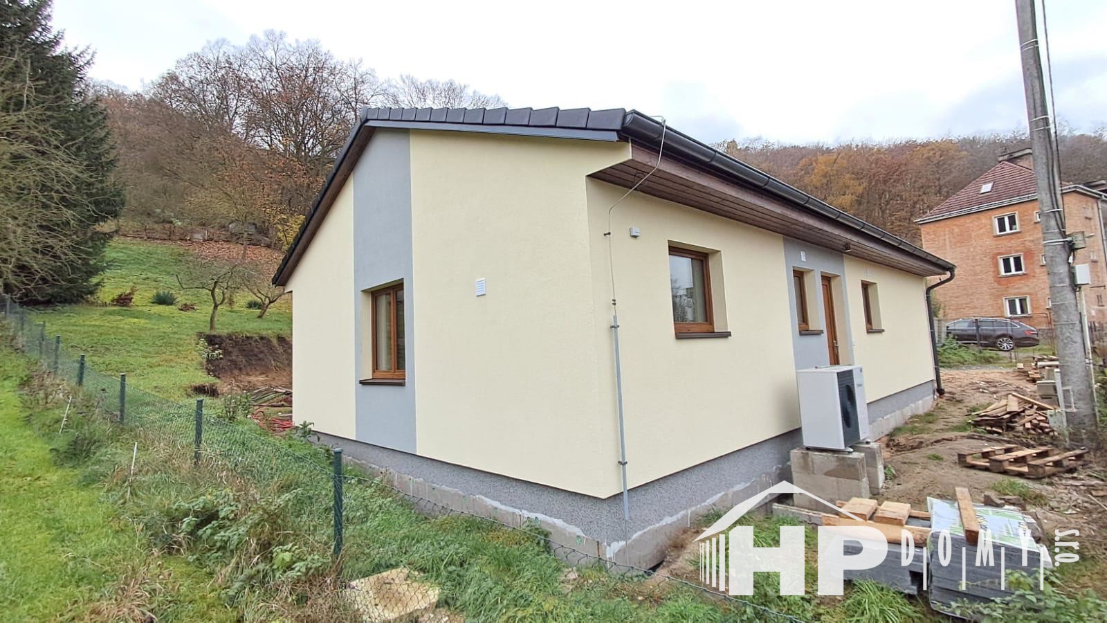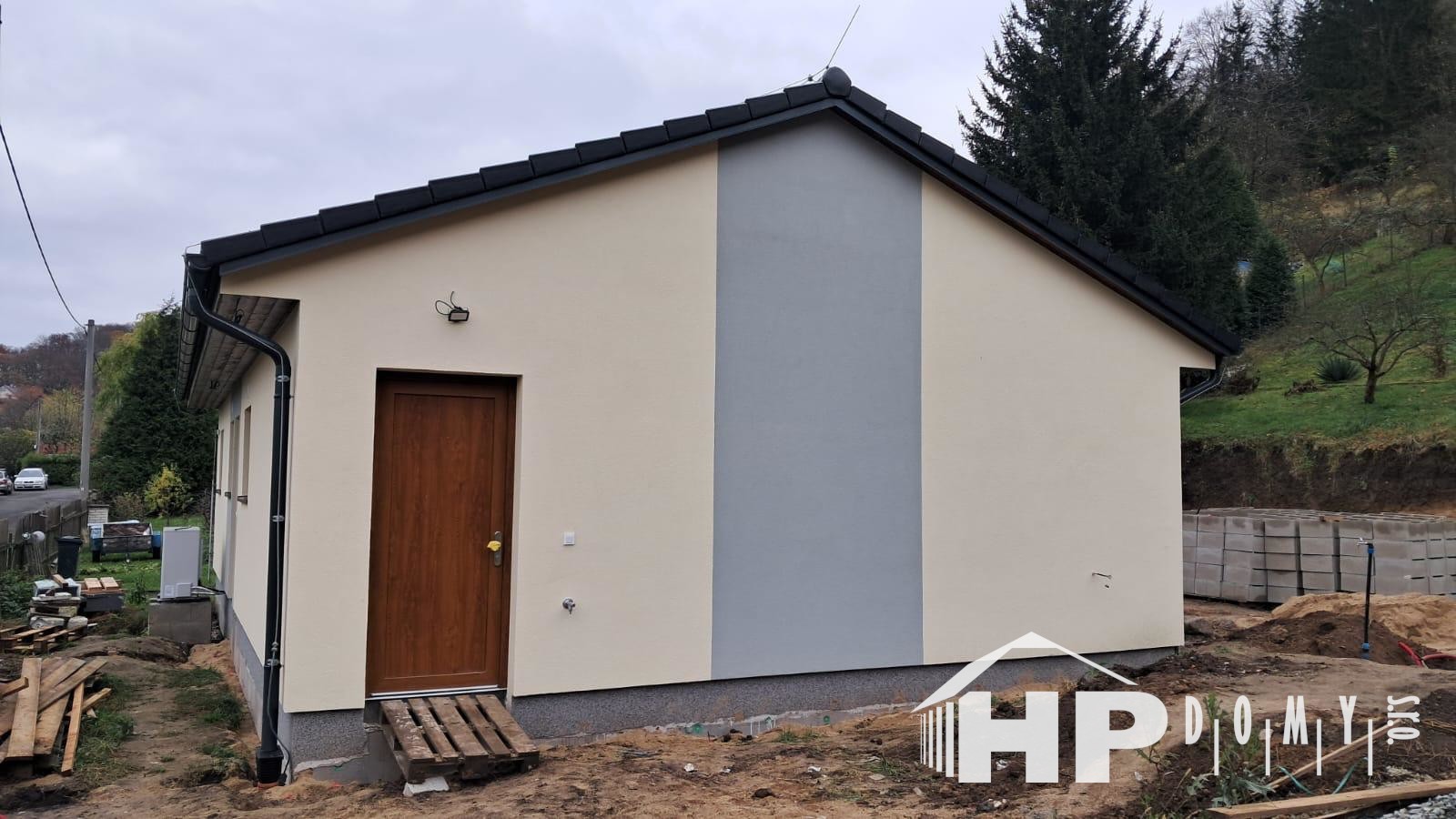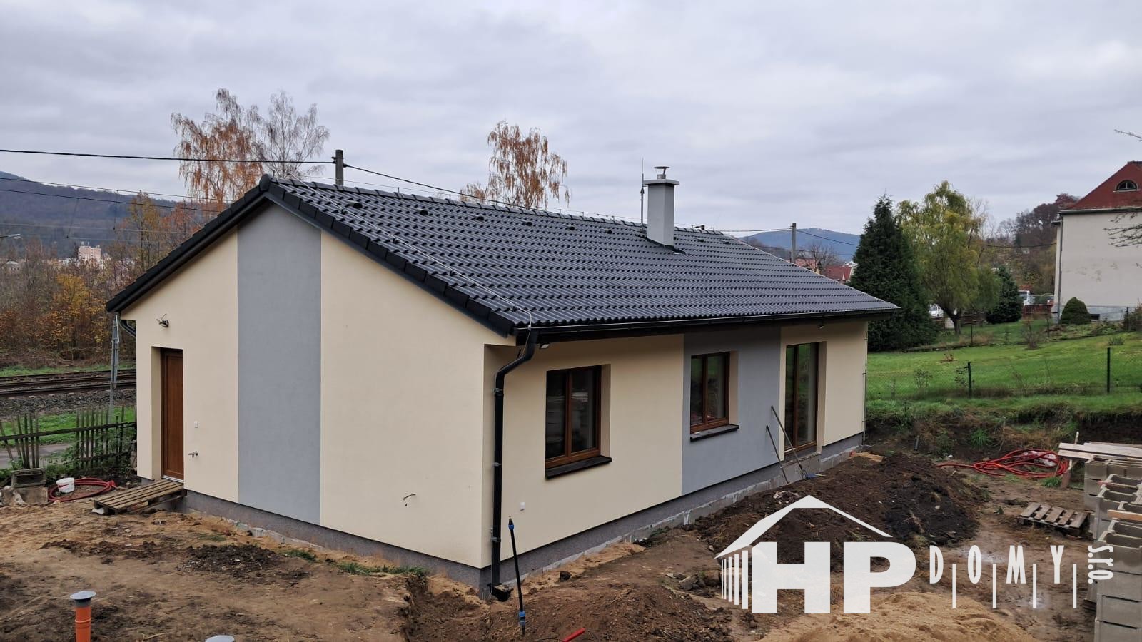 Dokončená realizace bungalovu HP90 v provedení dřevostavba v Ústí nad Labem. Na přání klientů byla upravena typová dispozice a jeden z pokojů byl rozdělen na šatnu a sklad s přístupem zvenku.