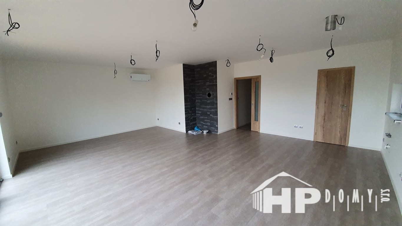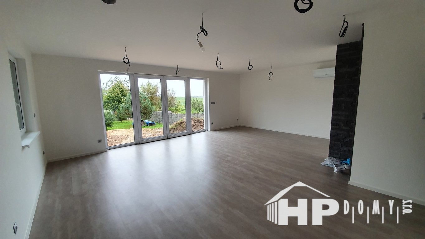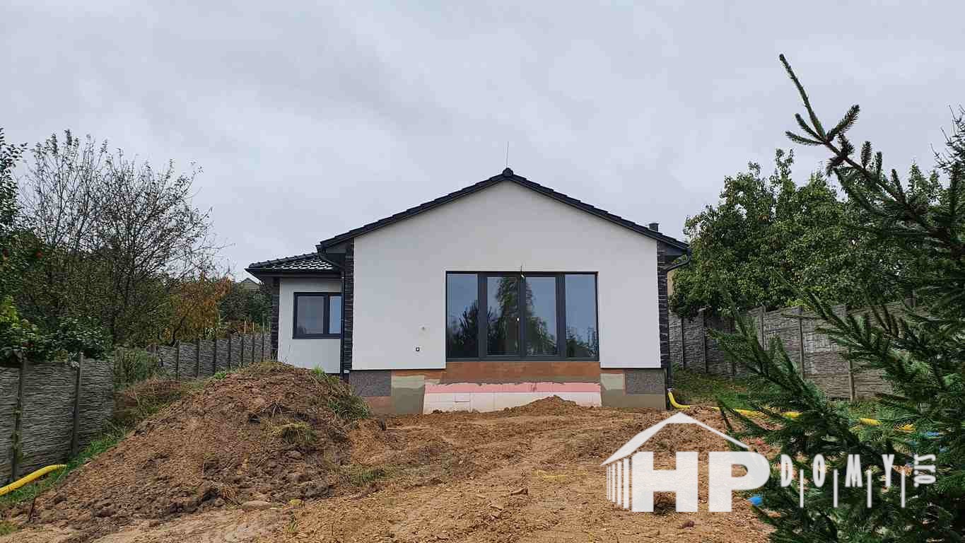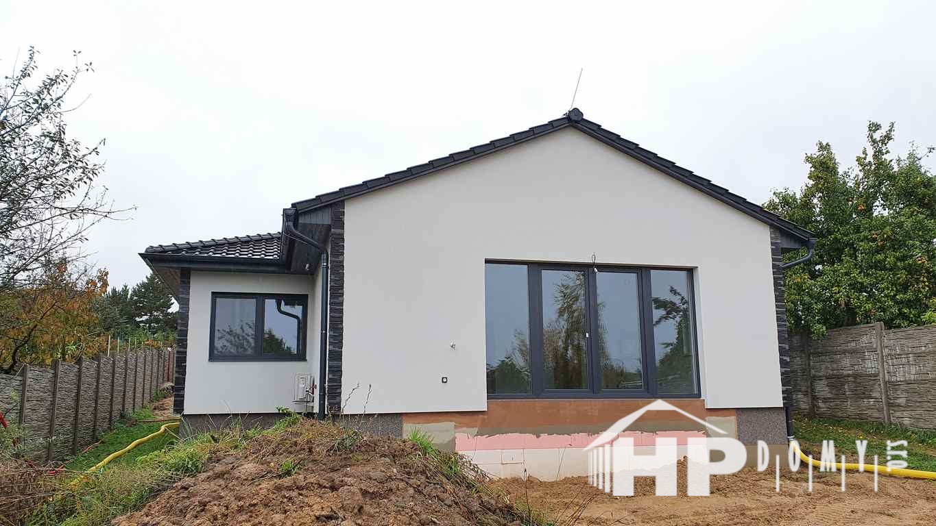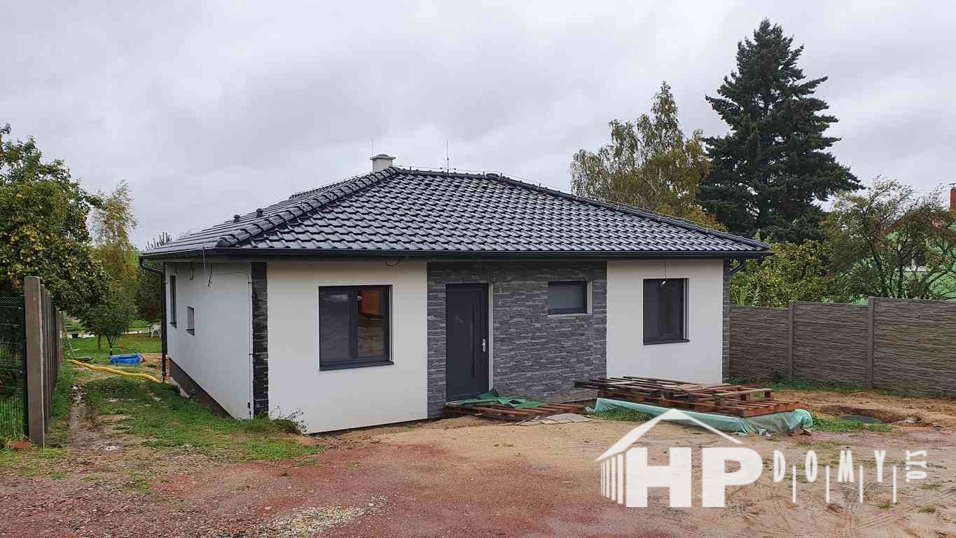 Dokončená stavba bungalovu o rozloze 98 metrů čtverečních a dispozici 4+kk ve Velkých Popovicích.
